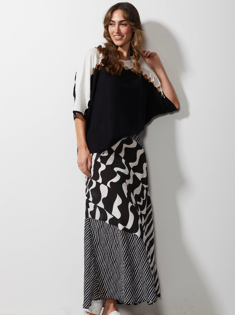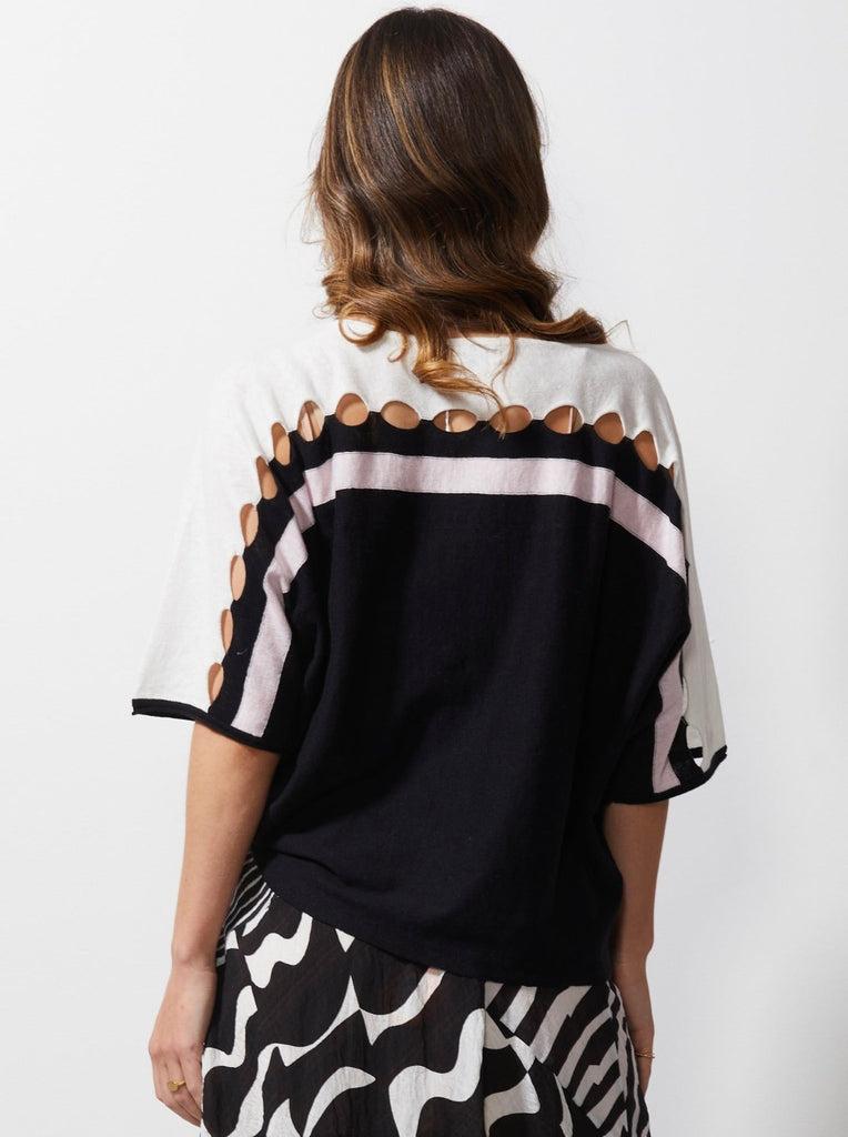 A contrast yoke top in black and white with a hole detail between the layers. Dolman 3/4 sleeve with a contrast colour stripe on the back.