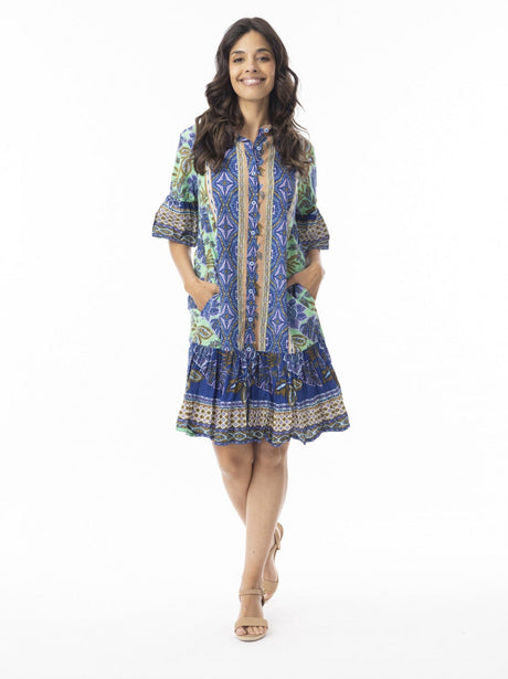The dress features a collared neckline and 3/4 frill sleeves, this dress falls gracefully at a knee length, giving the dress a playful feminine charm. Its unique design combines beautiful prints and colours, and convenient side pockets add a practical element to the style. Whether for a casual outing or a special occasion, this dress is perfect!