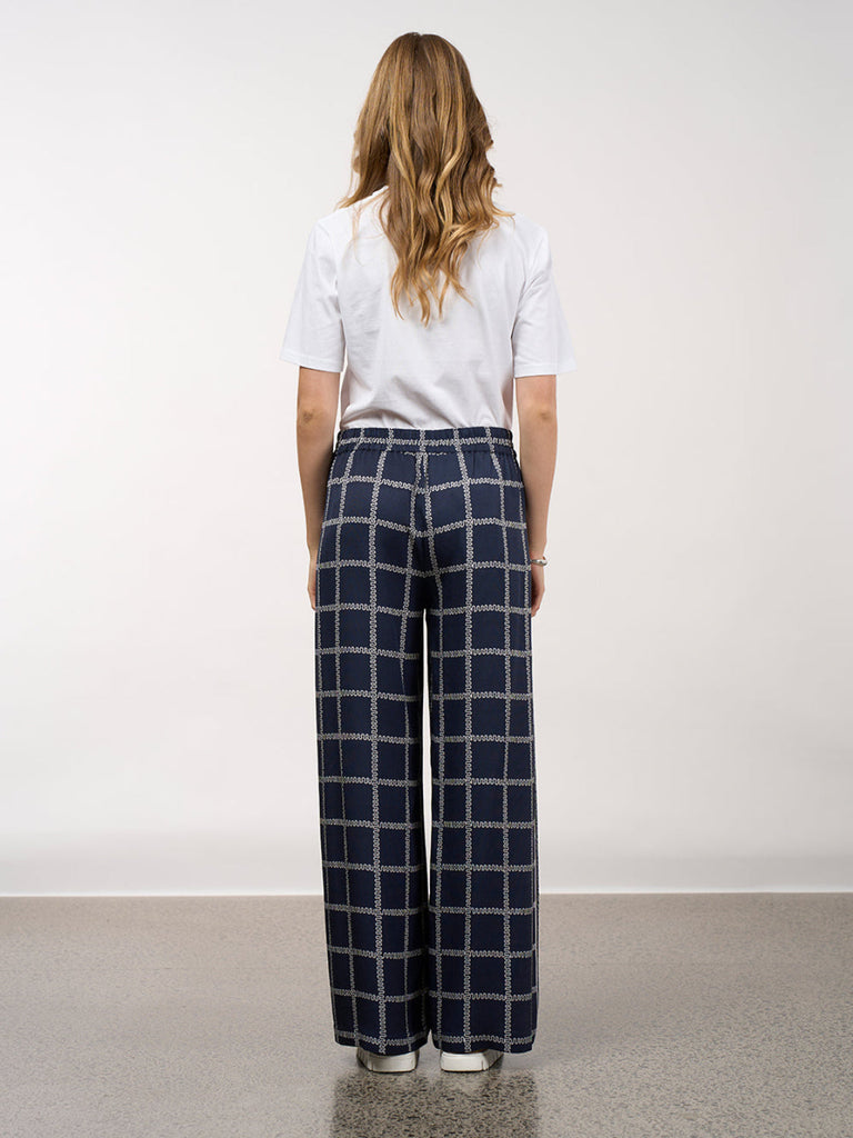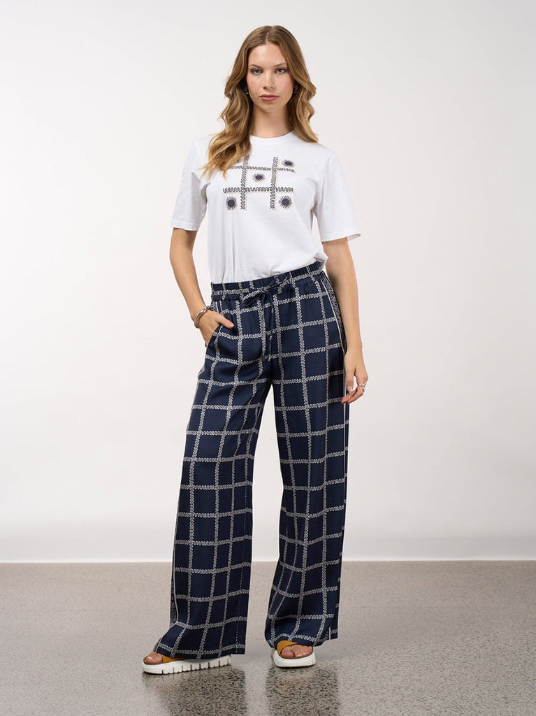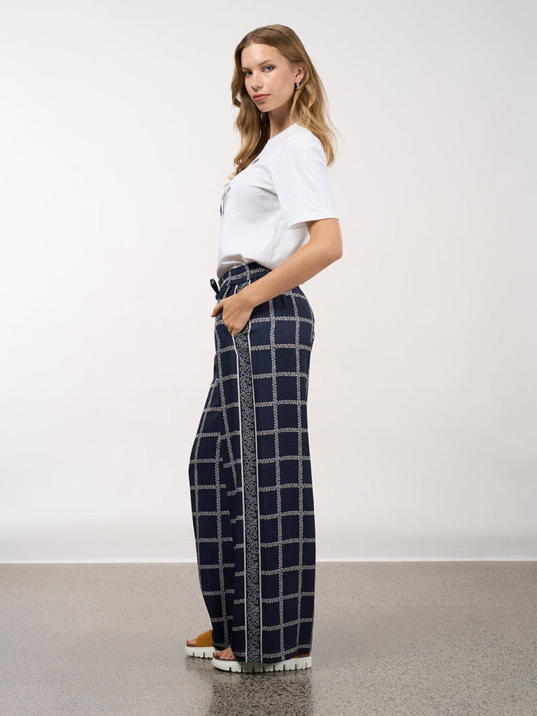 Relaxed fitting printed pant, with front pockets and an elasticated waistband, with a contrast print border at side seams.