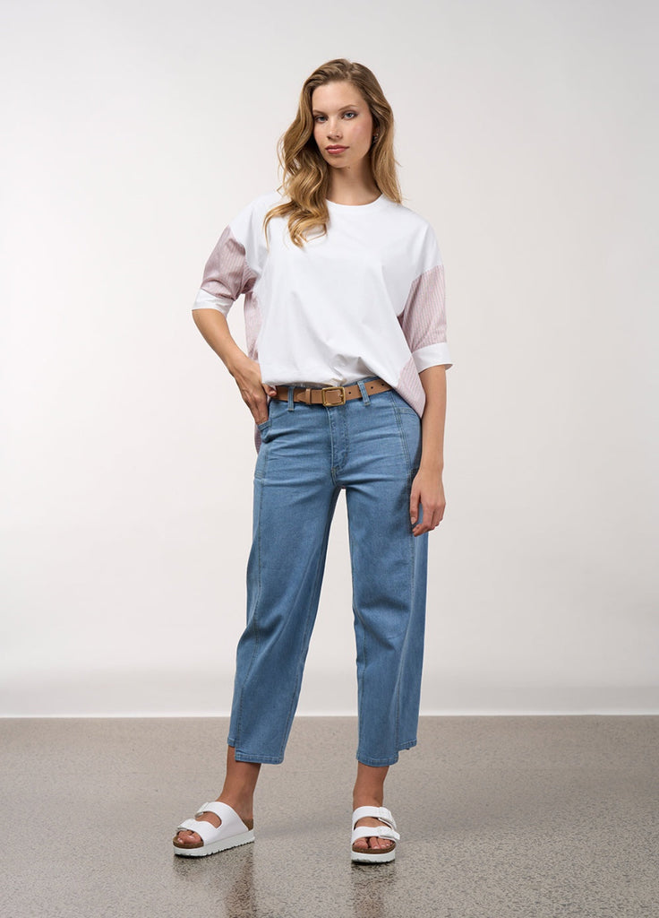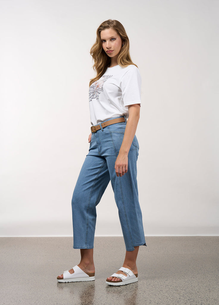 Relaxed fitted jean with a subtle tulip leg shape, with front angled pockets. Featuring side panels that are stepped at the hem, back patch pockets and signature MS branded hardware.