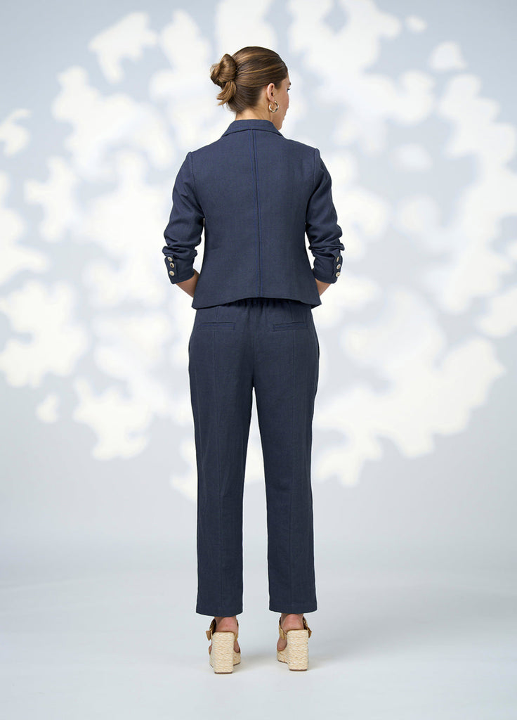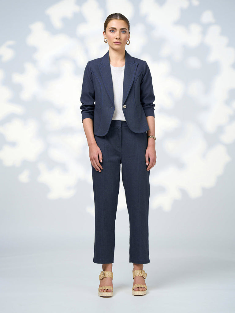 Tapered pant, with a mid-rise, and flat front, with flattering panel seams, and an elasicated back waist. Featuring inserted piping and zig zag embroidery detail with front angled pockets and side seams.