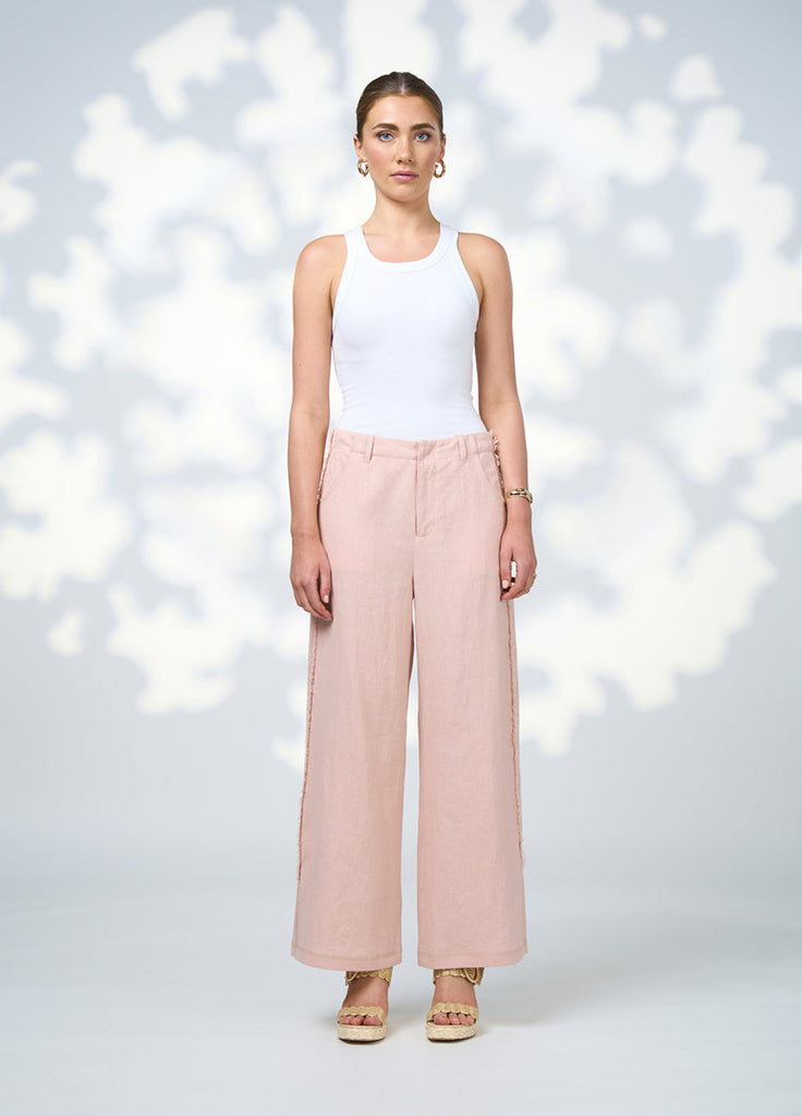The Romee Pant from Loobie's Story is a Wide leg pant, with subtle texture, in a mid-rise, with a flat front, and an elasticated back panel with back pockets. Featuring flattering panel seams and frayed denim look styling.