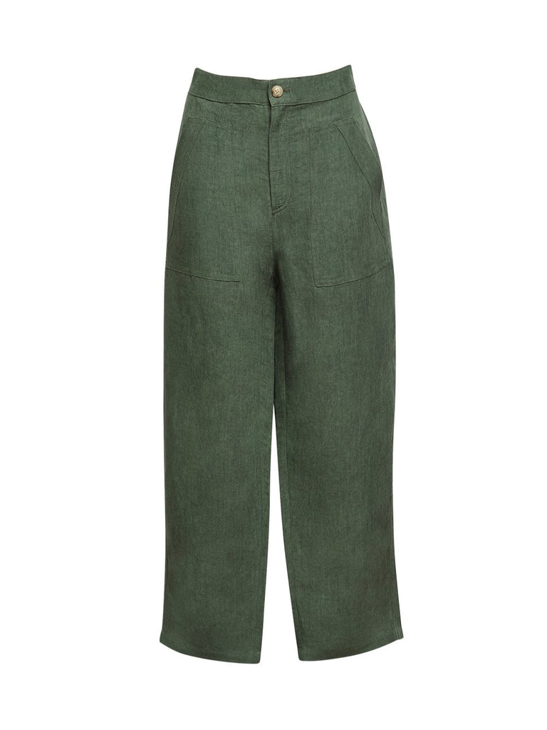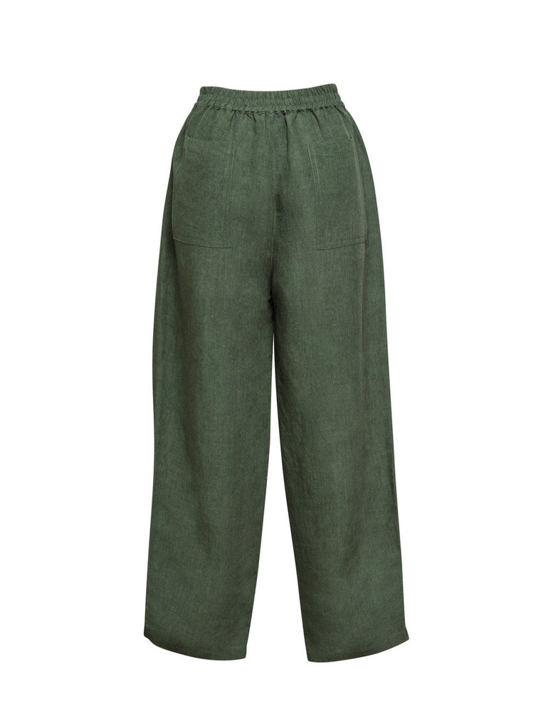 Tapered pant, in a linen blend, with a zip and fly front opening, and an elasticated waistband, featuring top stitched front patch pockets.