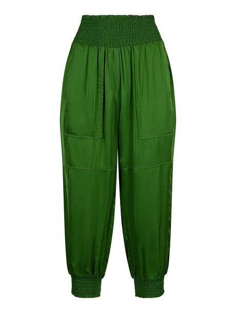 Tulip styled pant in a silky viscose, with a deep shirred waistband and shirred cuffs. Featuring forward side seams for a flattering fit. Functional pockets.