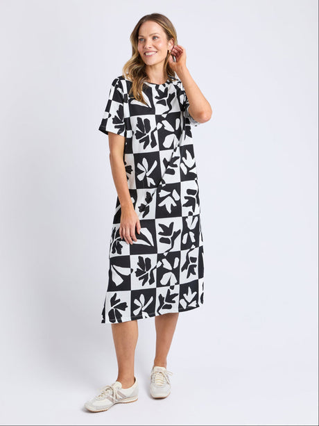 Effortless style meets everyday comfort in the Splice Dress. This relaxed tee shirt dress features a simple, flattering silhouette that works for any occasion—from casual outings to weekend errands. Short sleeves keep you cool, while practical side pockets add functionality without compromising the clean aesthetic. The striking black and white print makes a subtle statement. Simply throw it on and go—no fuss required. Perfect for those mornings when you want to look put-together without the effort