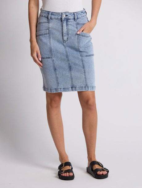 The Strike Skirt from Stella + Gemma is a slim fit denim skirt with panel seam details and front patch pockets. Logo patch on back waistband.