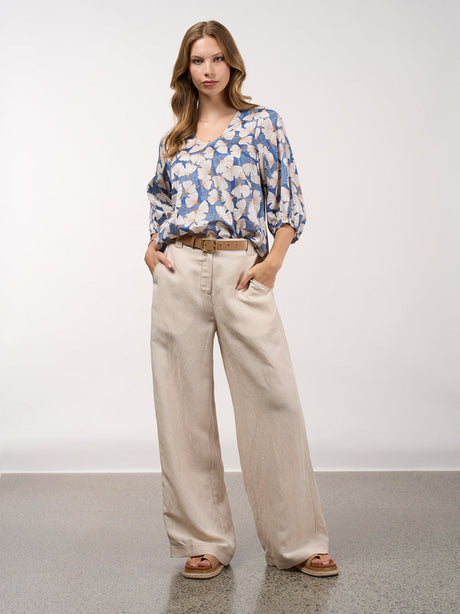 A printed top with a rounded V neckline, featuring 3/4 length blouson sleeves gathered into an elasticated cuff and side splits for ease of fit.
