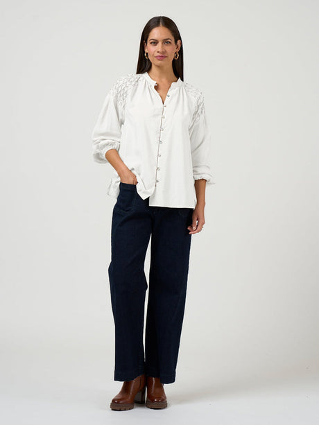 The Bijou Blouse from Loobie's Story is a floaty raglan blouse with a nehru collar and a button and loop closure. Featuring a smocked upper sleeve panel with delicately embellished metallic beads, with elasticated cuffs.