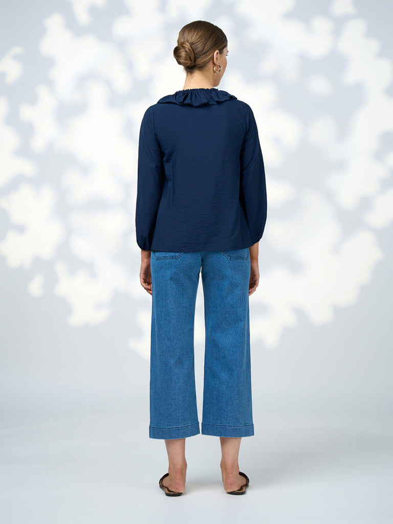 The Evie Blouse from Loobie's Story is a floaty, blouse with a deep V neckline and a ruffled collar. Featuring a centre front tie at the bust to secure the neckline. Blouson sleeves gather into thin elasticated cuffs.