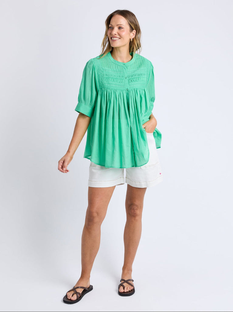 Featuring pretty pintuck details on the front placket and a full button front, this oversized/relaxed fitting shirt is perfect for wearing atop your favourite bottoms.