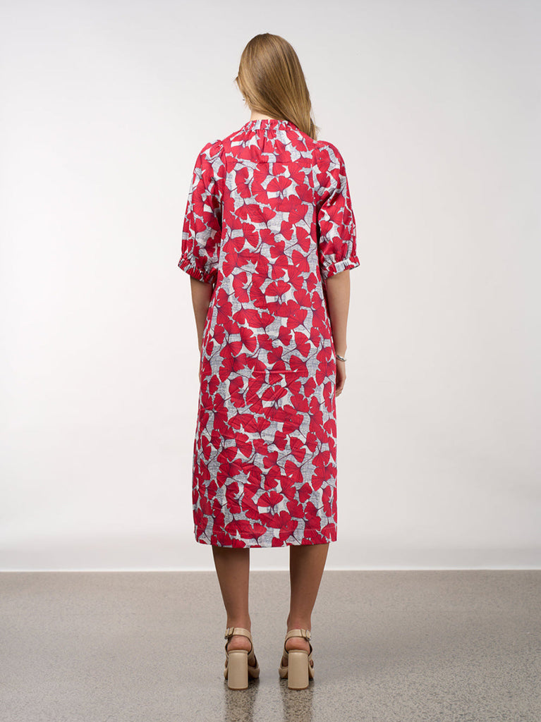 A printed, button-through dress, with a soft gathered neck band. Featuring stitched down in-seam pockets, blouson sleeves with elasticated cuffs and deep splits at the hem.
